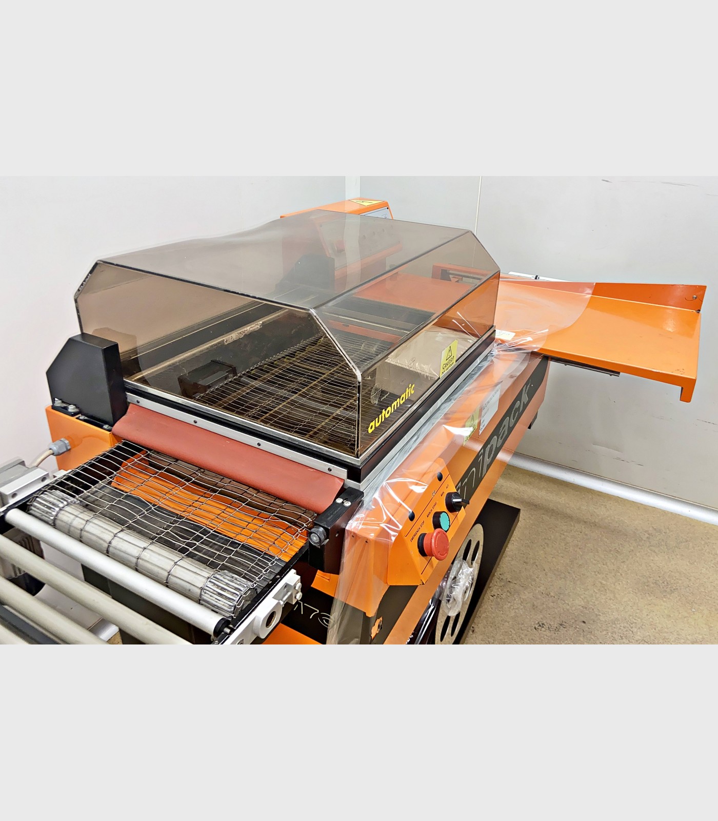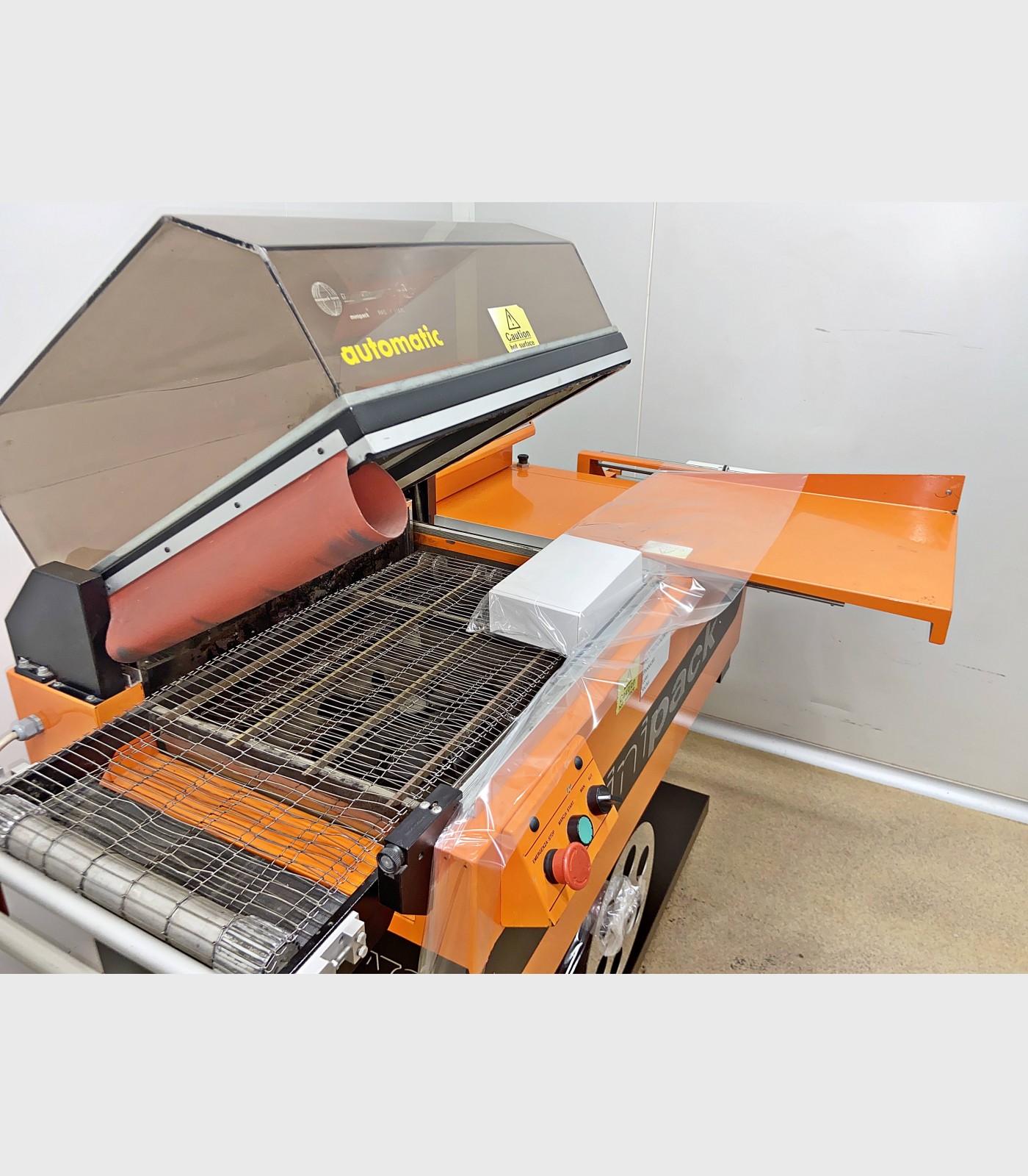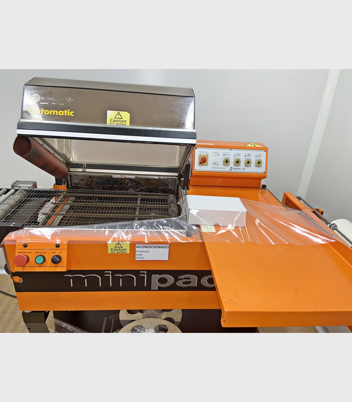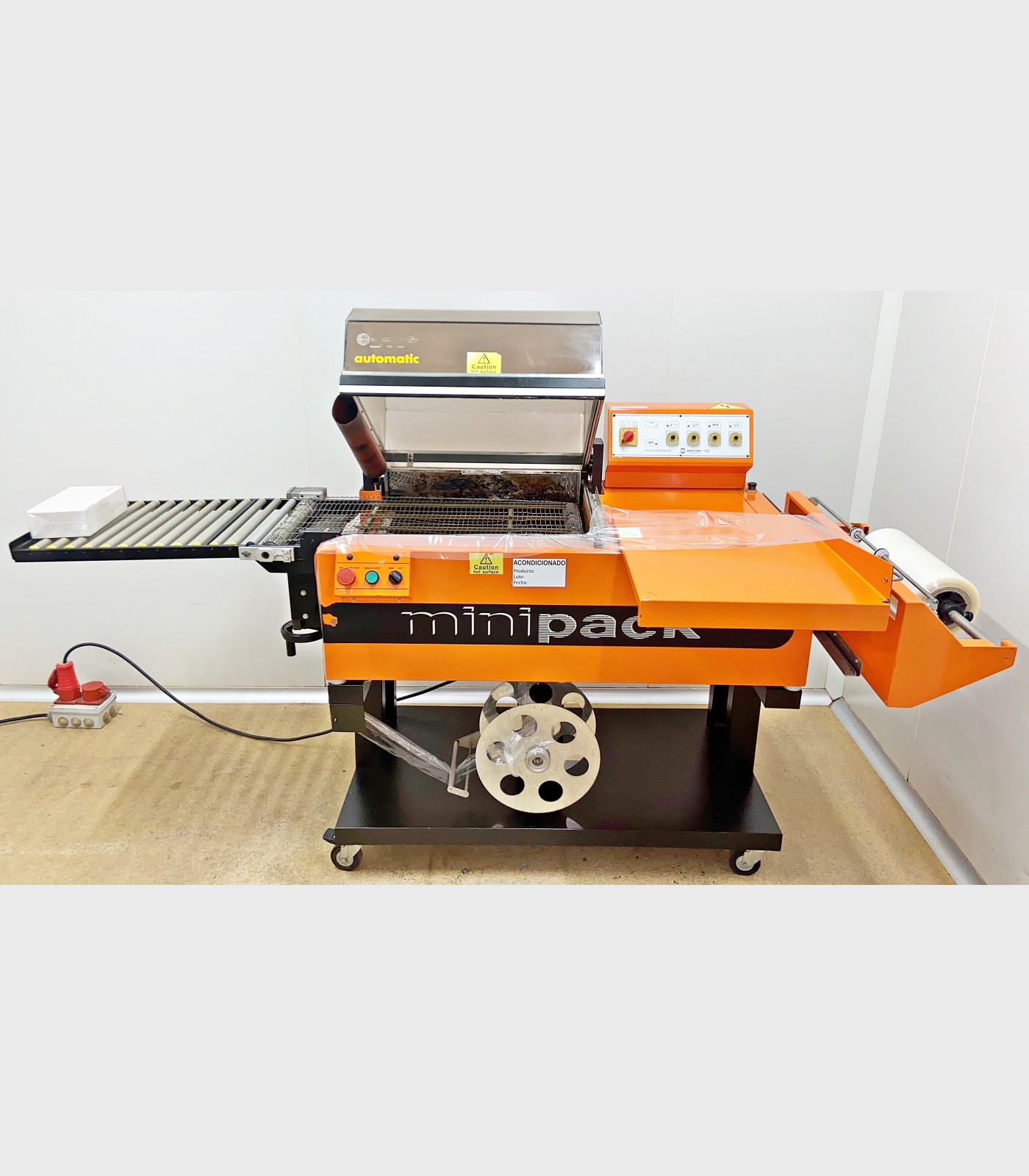 Retractiladora marca Minipack. Selladora y cámara de retractilado con una superficie de sellado de 540 X 390 mm y con una altura máxima de producto de 240 mm.